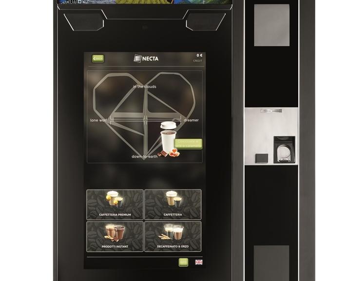 Elegantissimo, con i profili esterni in alluminio anodizzato nero, la porta nera con cabinet grigio scuro e un touch-screen tutto vetro, senza cornice: si presenta così Maestro Touch, il nuovo distributore al top della gamma Necta.